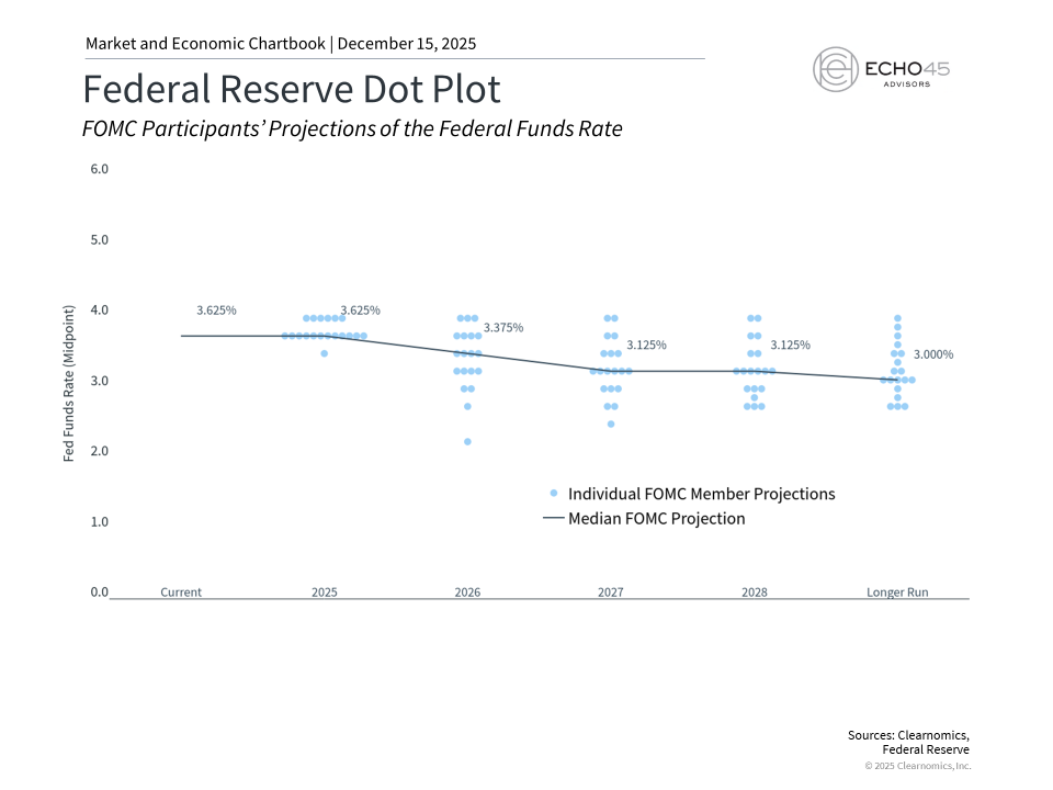 The chart above shows the FOMC’s latest Summary of Economic Projections. These figures suggest the Fed may cut rates only once in each of 2026 and 2027. Regardless of who the next Fed Chair nominee will be, it’s likely that the administration will appoint someone inclined to keep policy rates lower. This means these projections may change in the coming months.