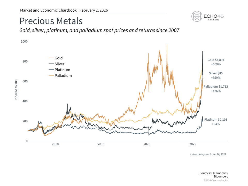 This reversal underscores both that precious metals are prone to boom-and-bust cycles, and demonstrates how quickly markets can shift based on policy expectations. While precious metals can serve investors, their volatility during January demonstrates why they need to complement, rather than replace, core holdings in stocks and bonds.