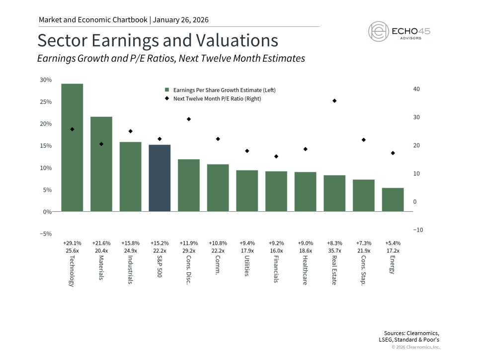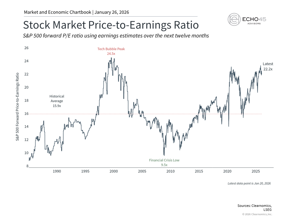 Another way to understand earnings and valuations is to calculate how much they each contributed to stock market returns in 2025. The price of the S&P 500 index rose 16.4% last year, so if earnings-per-share did grow 13% over the full year, then it was by far the largest driver of growth. Specifically, earnings contributed to 80% of the price return whereas the increase in valuations contributed about 20%.