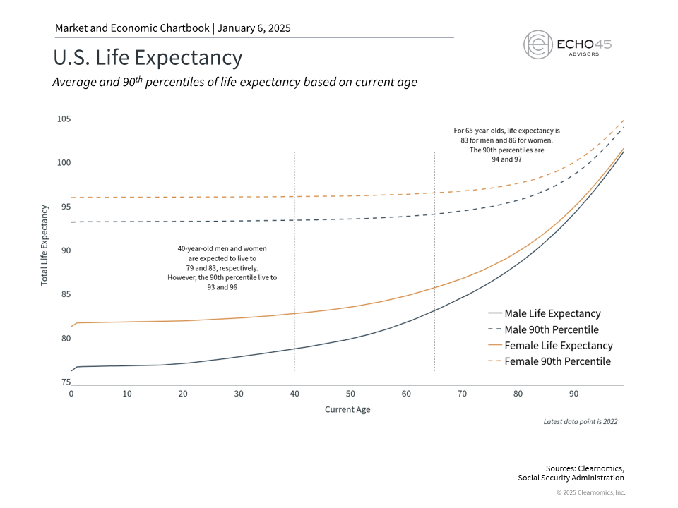 The accompanying chart shows that, according to the Social Security Administration, today’s 40-year-old men and women are expected to live to 79 and 83 on average, respectively. However, one in ten could live to 93 and 96, or longer. For those who are already 65, life expectancies are even higher. These demographic statistics suggest that, for many, planning for a retirement that lasts to the age of 80 is not enough – it could extend for decades beyond that.