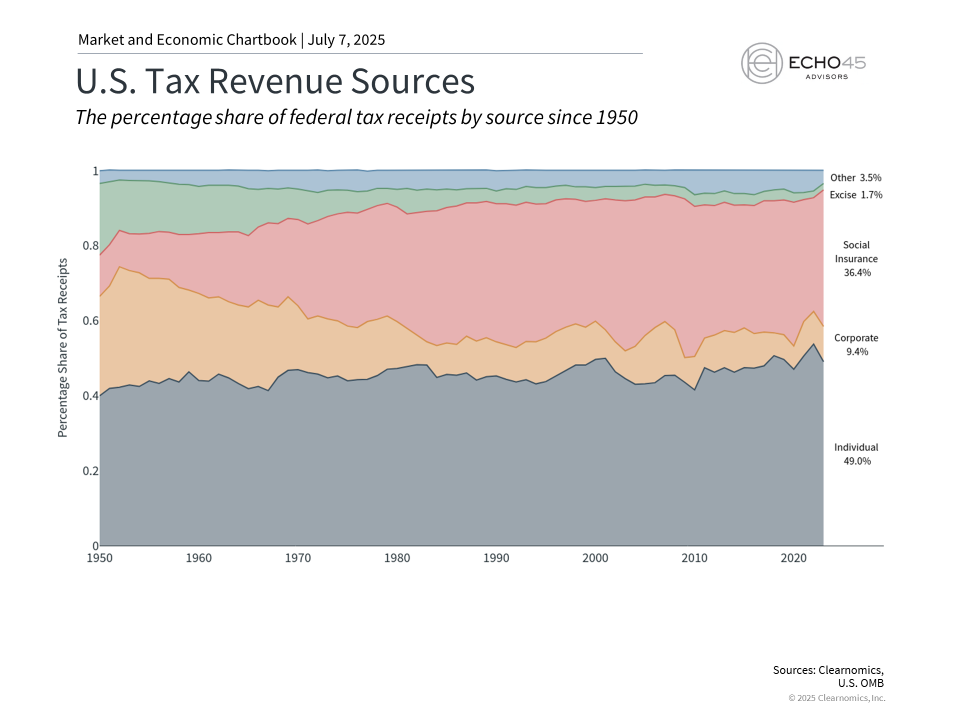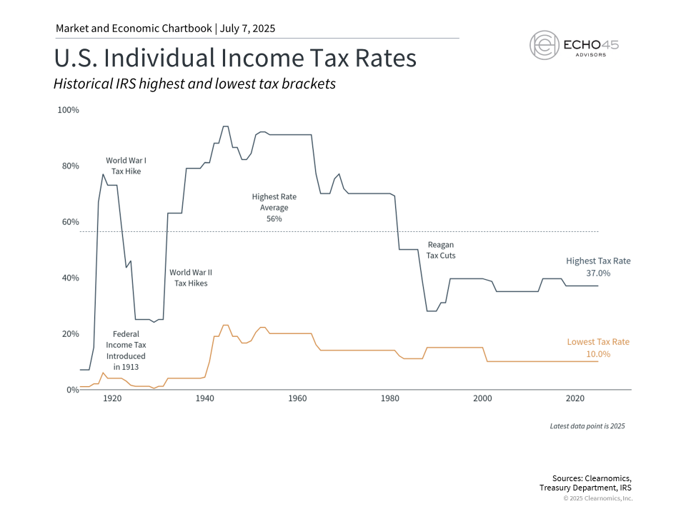 On an individual level, taxes directly affect many aspects of financial planning, and the specific provisions in this tax bill have immediate implications for household finances. From an economic perspective, many investors also worry about the level of government spending, the growing national debt, and other factors that have weighed on markets over the past two decades.