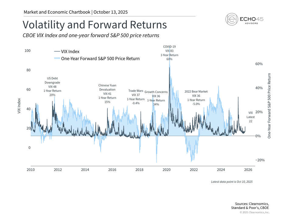 The accompanying chart highlights the relationship between the VIX index, a measure of stock market volatility, and the subsequent one-year forward returns for the S&P 500. Historically, spikes in the VIX have often resulted in strong forward returns, since this is when many investors are fearful of entering the market, or sell at inopportune times. This shows how counterproductive it can be to overreact to market swings.