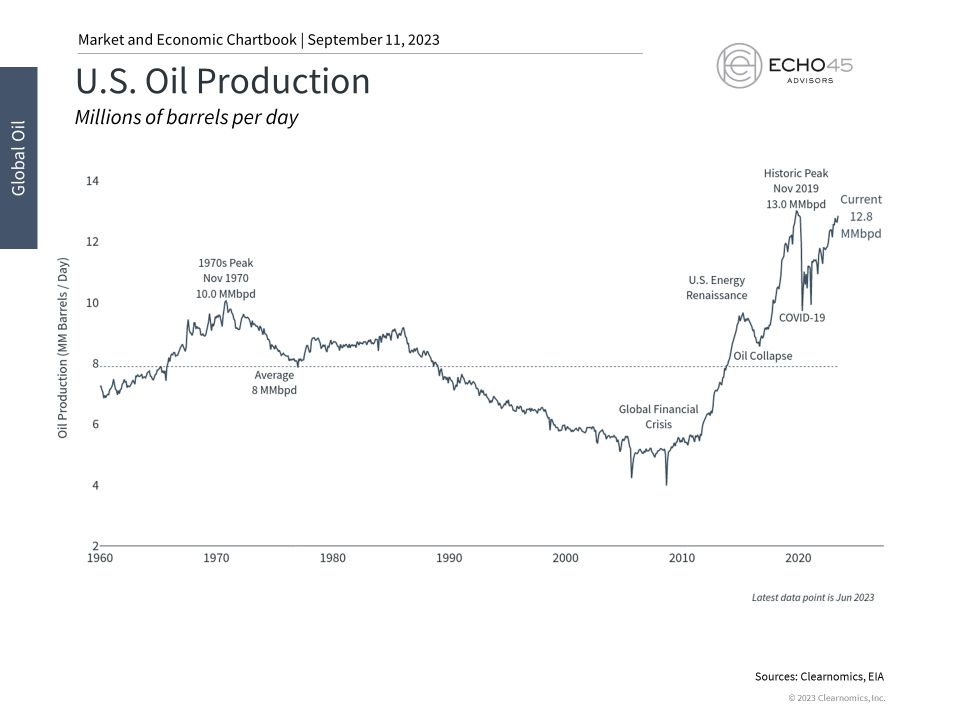 It's important to maintain perspective around these cuts. The relevance of OPEC as a price-setting cartel has declined over the past decade, partly because cuts by each country are voluntary and difficult to enforce, and because the U.S. has become the top producer of oil in the world. U.S. oil production, as shown in the accompanying chart, is nearly back to its pre-pandemic level of 13 million barrels per day. While there are many nuances in terms of the types of oil produced and consumed in the U.S., Europe, and elsewhere, the fact that the U.S. has been a "swing producer" has shifted the dynamics of the energy markets considerably.