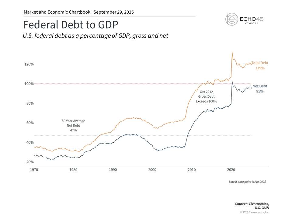 For some investors, the threat of a government shutdown may blend in with other fiscal issues such as the debt ceiling. The debt ceiling becomes a problem when spending the government has already approved needs to be paid for, but the Treasury Department isn’t authorized to borrow above a certain limit. The only solution in these cases is for Congress to raise the debt limit, or else the government risks defaulting on its obligations. All of these fiscal challenges are one reason the major credit rating agencies have downgraded the U.S. debt below AAA. Fortunately, the One Big Beautiful Bill Act also raised the debt ceiling by $5 trillion, so this problem can be avoided for some time.